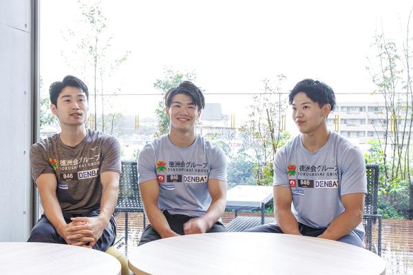 左から、森近 直樹コーチ、藤巻 竣平選手、上山 廉太郎選手