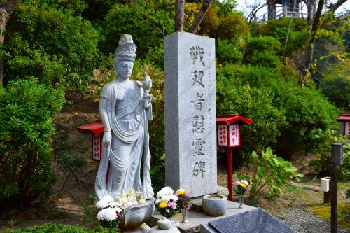 大船観音寺の境内に、広島原爆の残り火が、今でもこの灯籠の中で灯され続けています。広島原爆投下から45年にあたり、福岡県星野村の平和の塔から分火されたものです。「戦没者慰霊碑」には多くの折り鶴が掲げられています。