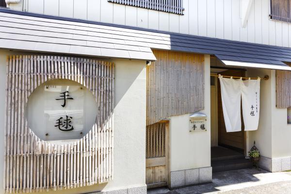 江ノ電長谷駅から徒歩7分、閑静な住宅街に佇む「鎌倉 創作和菓子 手毬」。白い暖簾がかかった建物が和菓子作り体験教室、右手に進むと「茶寮てまり」があります。