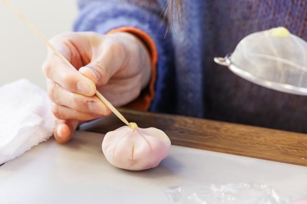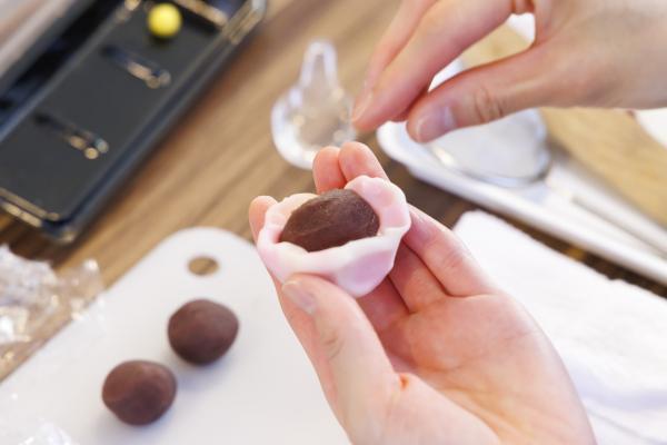 淡い桜の色合いは、白餡を平らに伸ばし、丸めたピンクの生地に覆いかぶせて包む「包みぼかし」という技法で表現します。次に、白×ピンクを合わせた生地で、中に入る黒餡を包みます。