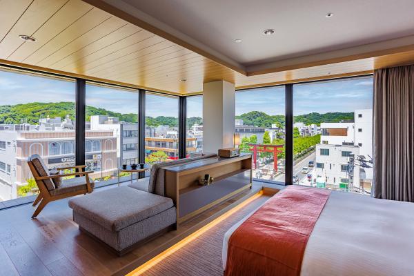 全138室12タイプの客室があり、写真は窓から二の鳥居が眺められるプレミアムコーナールーム。シンプルモダンなインテリア、使いやすく配置された室内設備、充実したアメニティが揃い、快適そのもの。全室がユニットバスではなく、洗い場付きバスルームを備えているのも特徴です。