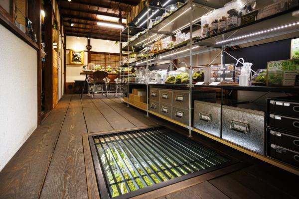 店内の棚にはガラス容器に入った苔がずらりと並べられ、研究室のよう。入口すぐの床は掘りごたつの穴だった場所で、ミズゴケが栽培されています。店内奥の縁側から眺められる庭にもミズゴケ園があり、5月頃~夏は蛍光グリーンに輝いて見えるのだとか。