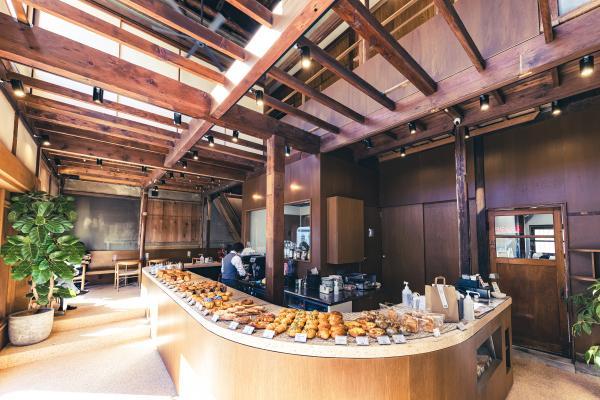 築100年以上という建物の柱や梁を活かした吹き抜けの造り。大きなカウンターに30~40種類のパンが並ぶ様は圧巻です。パンの焼き上がりは11時頃がピークで、昼過ぎからデニッシュ系のスイーツパンの品揃えが豊富に。座席を確保した後、パンやドリンクを選び、レジで会計し、席に届くのを待ちましょう。