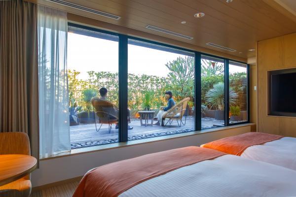 全12タイプの客室があり、どの客室も魅力的ですが、ゆったり過ごしたい大人向けなのは1室限定の「ガーデンツインルーム」。33平方メートルの客室に140cm幅のベッドが2台あり、壁一面が大きな窓!窓の外にはリゾート感あふれるテラスがあります。