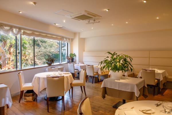 店内は白を基調としたインテリアで、約30席をゆったりと配置。窓を額縁にして、春は桜、秋は紅葉が眺められます。本格フレンチレストランながら、おもてなしは家庭的。肩ひじ張らずに食事を楽しんで。