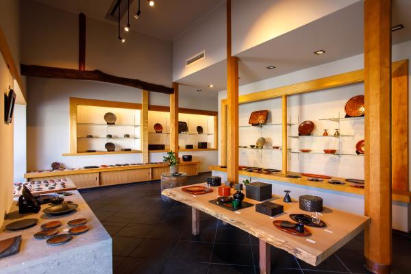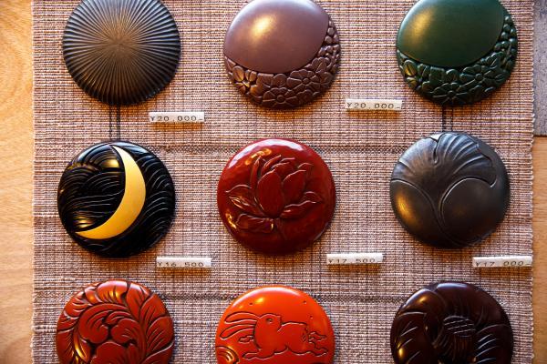 整然と鎌倉彫が陳列された店内は美術館のよう。陰影豊かな彫り、つややかな漆の色、大胆な図柄のものもあり、時間を忘れて見入ってしまいます。美しいことはさることながら、用の美も兼ね備えており、丈夫で使いやすく、使い込むうちに手に馴染み、味わいが増すのだとか。お盆や重箱、椀、平皿、ブローチ、帯留など、アイテムもさまざまに揃っています。