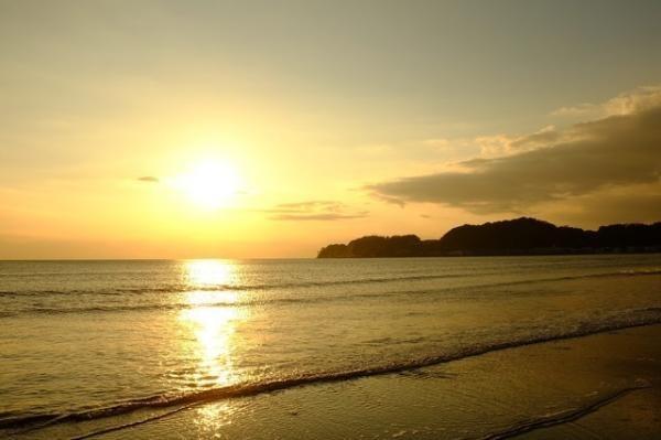 由比ヶ浜海岸は、鎌倉の海水浴場として有名ですが、夕日が美しいスポットとしても知られています。鎌倉駅からは江ノ電に乗って長谷駅や由比ヶ浜駅で下車すれば、歩いて5分ほどの道のりです。遠浅の砂浜が広がり、安定した海風が吹くのでサーフィンを楽しむサーファーの姿も見かけます。訪れたのがちょうど夕刻だったので、タイミングよく稲村ヶ崎方面に太陽が沈むシーンが見られました。オレンジ色に染まる空と、水面がとてもきれいです。