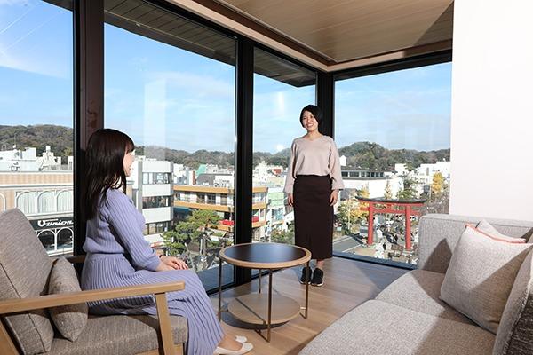 プレミアムコーナールームは二面に大きな窓がとられた角部屋です。窓の外には鶴岡八幡宮の二ノ鳥居を眺め、部屋に居ながらにして鎌倉らしい眺望を満喫できるちょっと贅沢なお部屋です。