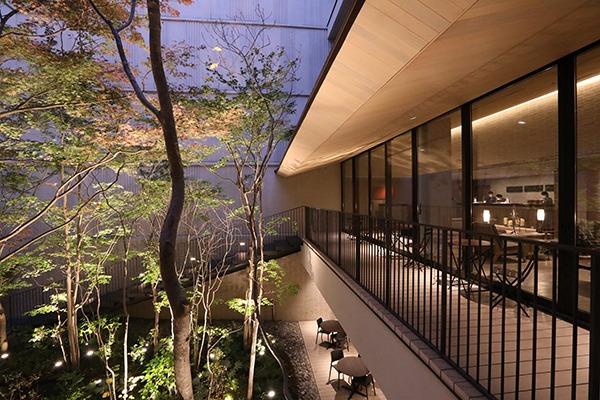ロビーの屋外にあるテラスは、日本建築の縁側のエッセンスを取り入れて設計されています。夜にはライトアップされた木々が素敵な演出をしてくれます。