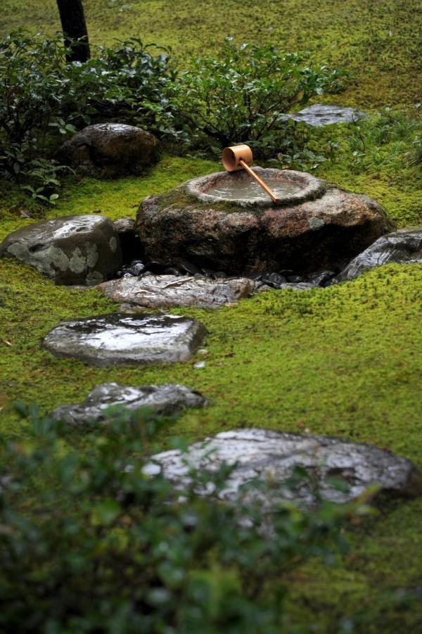 苔むした庭園に飛び石やつくばいが設けられています