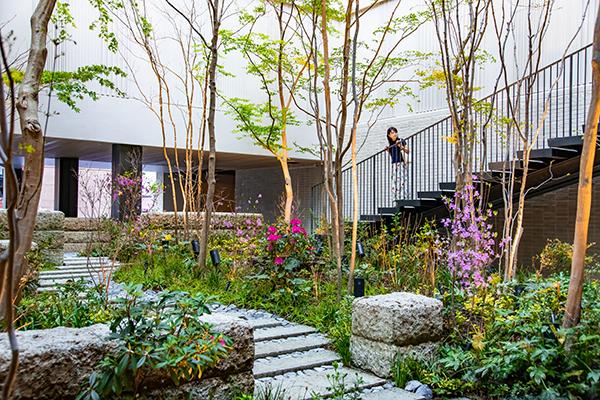フロントがあるのは2階。路地のようなエントランスからエレベーターを使う他、中庭の脇にある階段も利用できます。大谷石を配した中庭は、街の喧騒がうそのような静かな空間。春はツツジ、秋はモミジやカエデの紅葉も見られるそう。