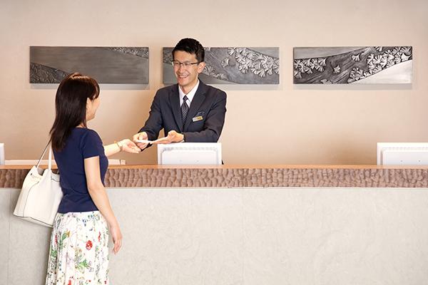 階段を上った正面がチェックインカウンターです。壁のアートワークはイチョウを陰影豊かな鎌倉彫で表現したもの。イチョウはホテルメトロポリタン 鎌倉のビジュアルイメージで、カードキーなどにもデザインされているんですよ。