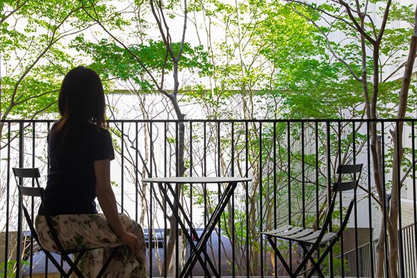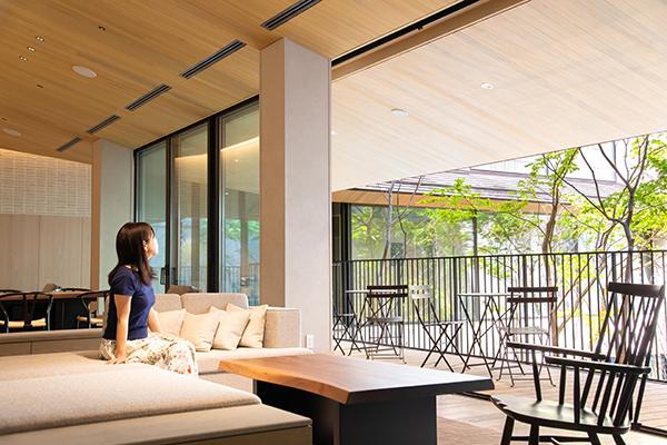 ロビーはベージュを基調に、木のぬくもりあるインテリアでまとめられ、ほっとくつろげる雰囲気。足元まである大きなガラス窓からテラスはひと続きで、日本建築独特の“縁側”のエッセンスを取り入れて設計されています。