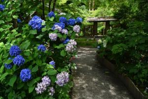 涼しい参道を進むと二天門の前でガクアジサイが迎えてくれます。境内には色とりどりのアジサイがあり、どれも見頃です。