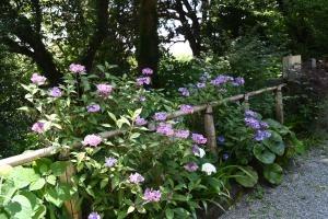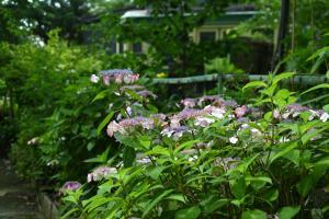 円覚寺境内にある塔頭の松嶺院。山野草や茶花が植えられ、様々なアジサイ・ヤマアジサイのほかに エゾカワラナデシコ、クガイソウ、ホタルブクロなどが咲いていました。