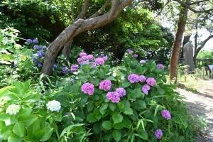 芝生の斜面や最上部の展望広場周辺でアジサイが咲いています。