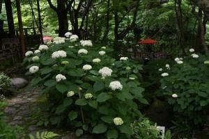 アジサイの多くが色づき見頃を迎えています。山の斜面いっぱいに咲き誇る有名なあじさい路の他、境内随所で色々なアジサイが楽しめます。2枚目はあじさい路入口手前のアナベルです。