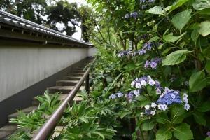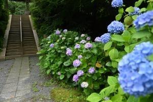 大覚池のほとりや山門入口階段下のアジサイが見頃です。