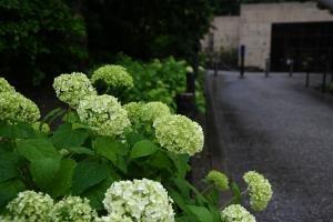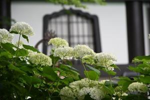 境内にあるレストラン、石窯ガーデンテラス前の白いアジサイが見頃を迎えています。
