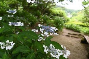 散策路のヤマアジサイが見頃を迎えています。このほか、石窯ガーデンテラス前のアジサイ「アナベル」はまだ蕾です(画像なし)。