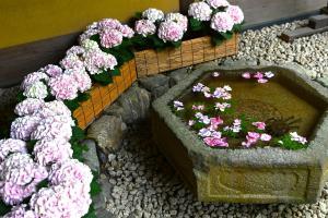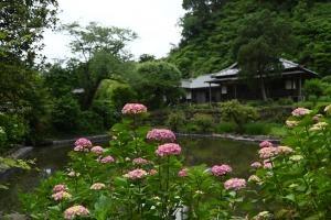 浄明寺地区にある一条恵観山荘。ヤマアジサイが見頃です。滑川(なめりかわ)のせせらぎを聞きながら、竹林やアカマツのある庭園の風情をゆっくりと味わえます。 一部のアジサイが見頃、アナベルはまだ蕾です(画像なし)。