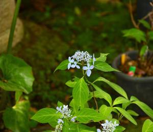 様々な地植えや鉢植えのヤマアジサイが楽しめます。1枚目は普賢の華、2枚目は剣の舞錦という品種です。