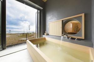 Yuigahama 千世では、オーシャンビューの浴室や屋久杉のテーブルなど、こだわりの空間で非日常を満喫。自然音と高音質スピーカーが癒しの時間を演出します。