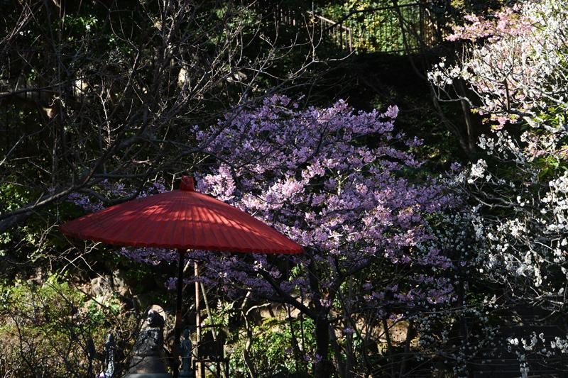 梅の見頃が続き遅めの品種も見頃になりました。下境内の中心の大きな枝垂れ梅も、まだ見ごたえがあります。境内入って左側にある妙智池付近の河津桜が見頃間近です。