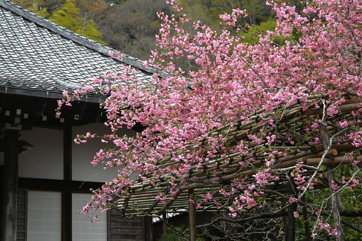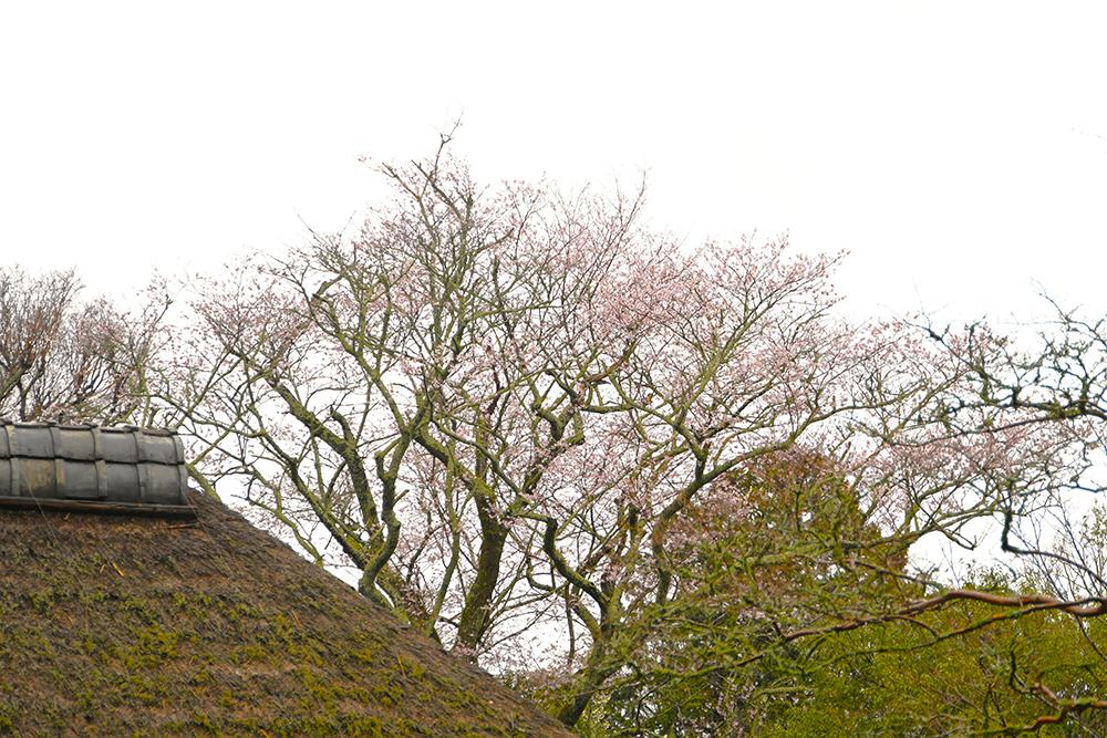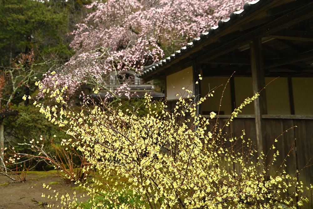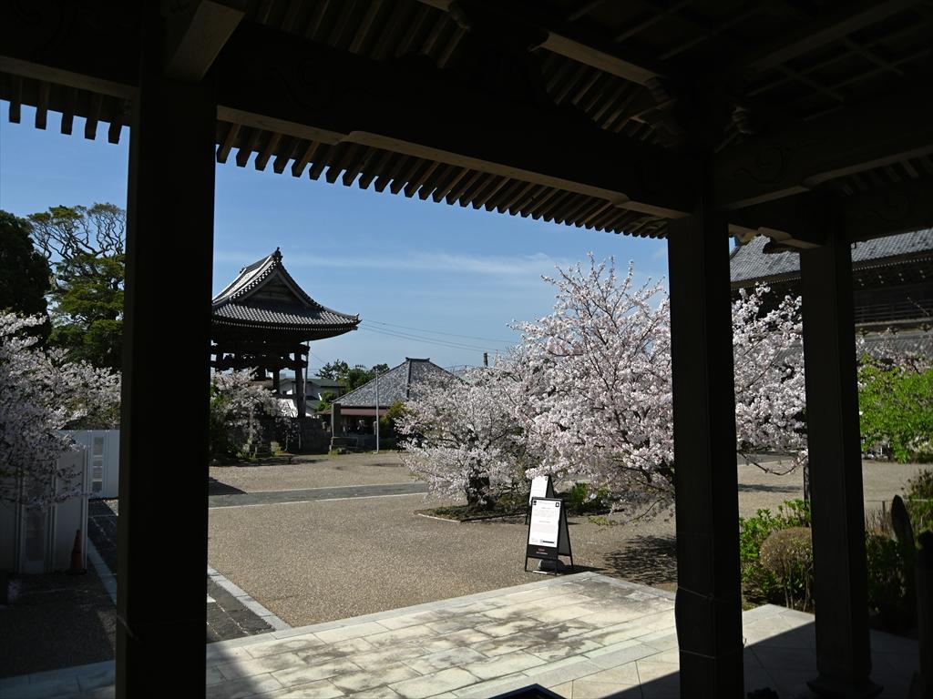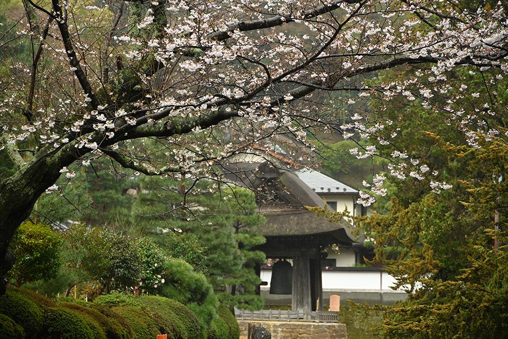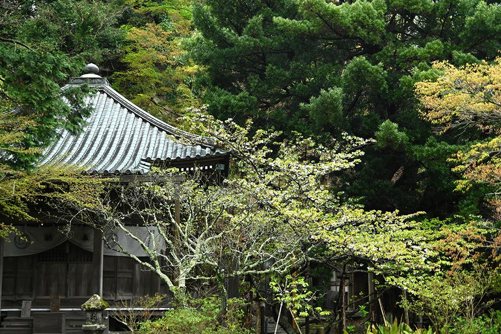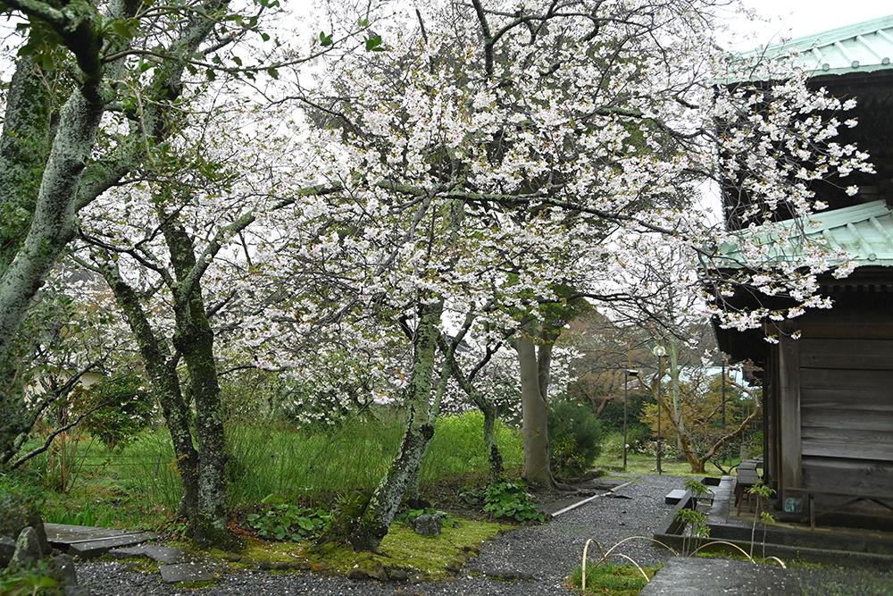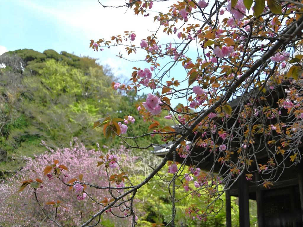 お寺を囲む山並みの上の方にはオオシマザクラやヤマザクラが咲いているのが見えました。