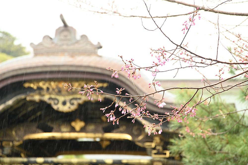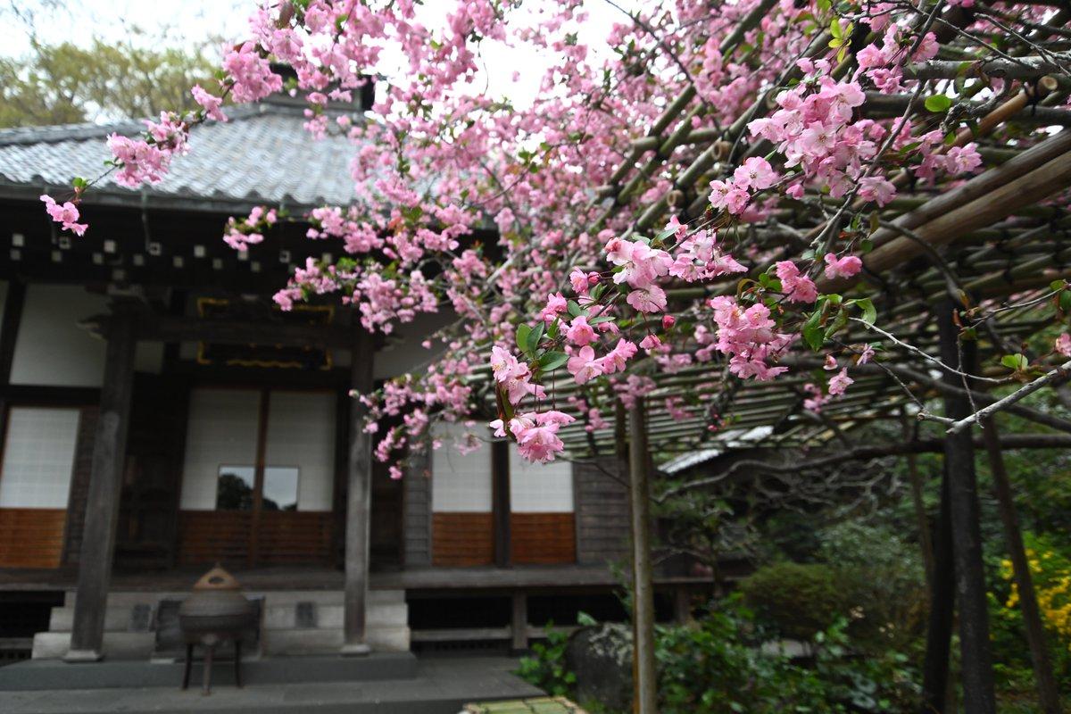 山門横に植えられた、浄土宗の名僧 祐天上人にちなんで名付けられたという「祐天桜(ユウテンザクラ)」が見頃です。