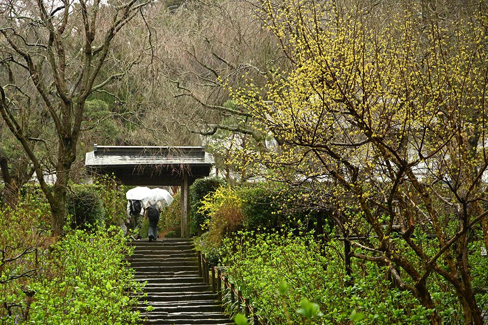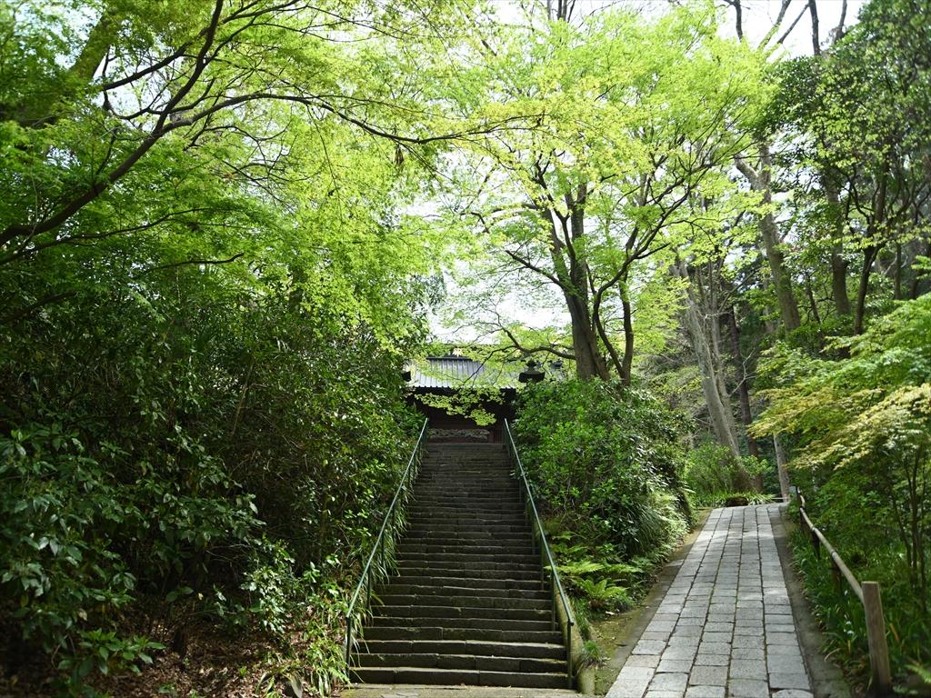 コブシも咲き誇り、門を潜り抜けると階段の苔の色が鮮やかになってきています。