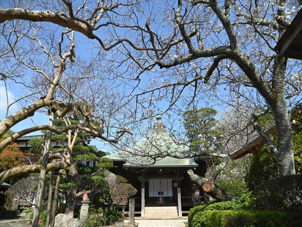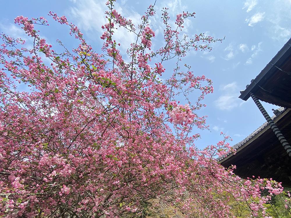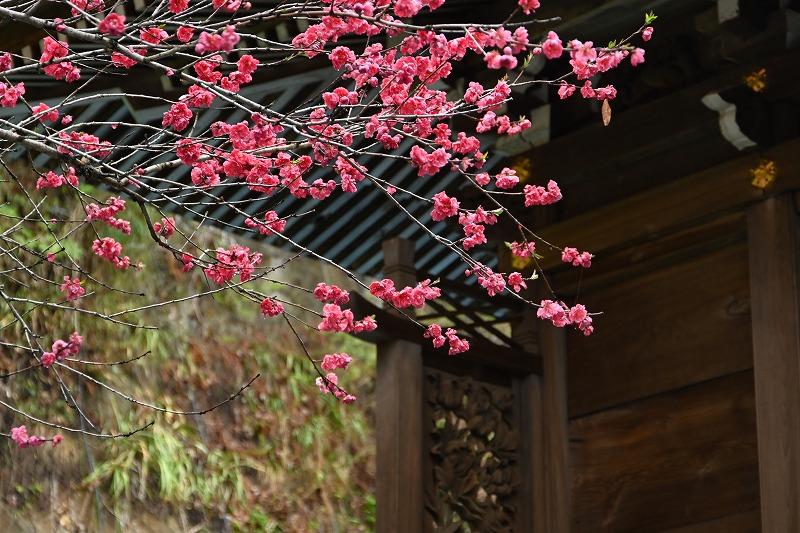 本堂左手には源平咲きのハナモモが、このほか画像はありませんが八重のヤマブキやスイセン、シャクナゲ、各種のツバキも咲いていました。