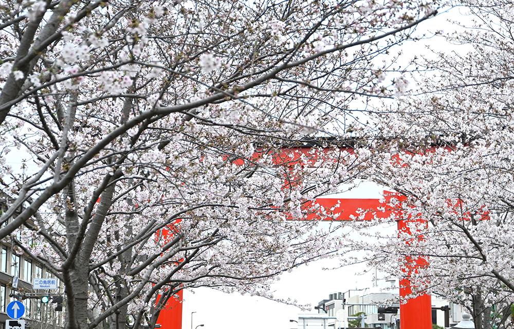 鶴岡八幡宮の参道である 若宮大路 二の鳥居 付近では、街路樹として植えられた 玉縄桜 が見頃です。