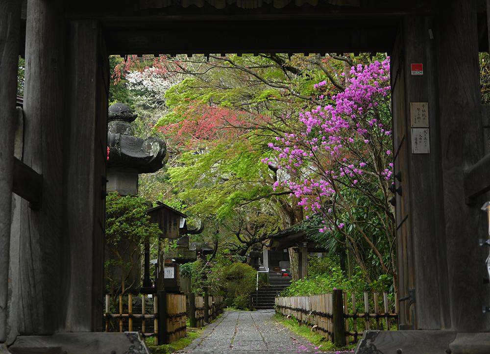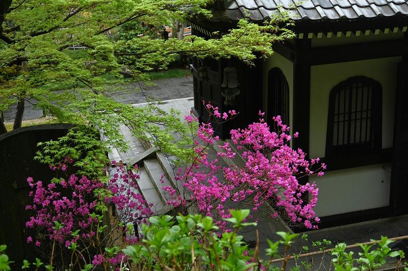 山門を入ったところにはミツバツツジが咲き、出猩々(でしょうじょう)というモミジが独特の赤色の新芽を伸ばしはじめています。