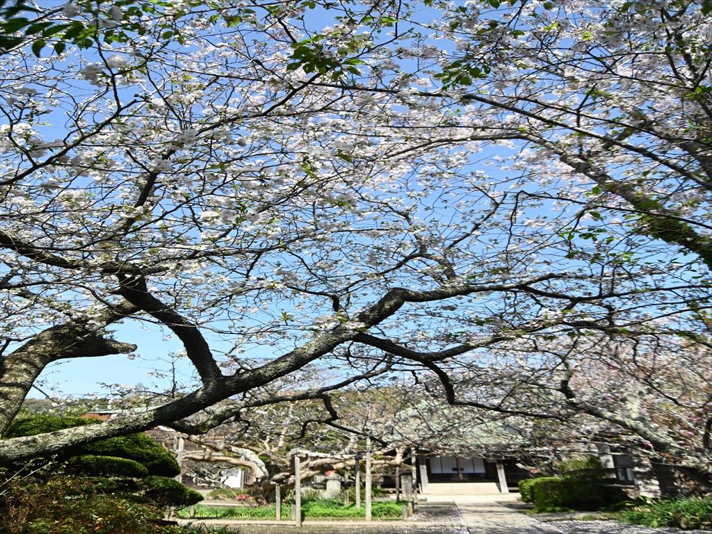 境内の御小庵の前にある鎌倉市の天然記念物「妙法桜」が見頃を迎えています。駐車場にも同じと思われる桜が咲き、こちらは間近で見られます。