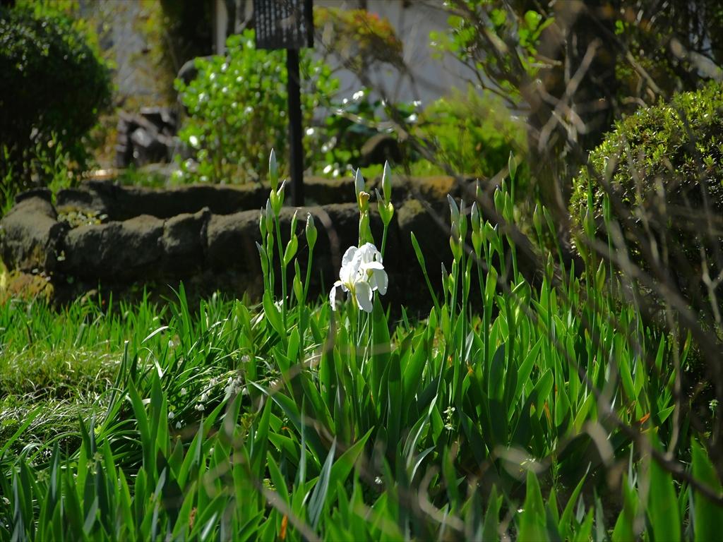 客殿前にはアヤメ科のシロバナイチハツ(白花一初)も咲きはじめました。