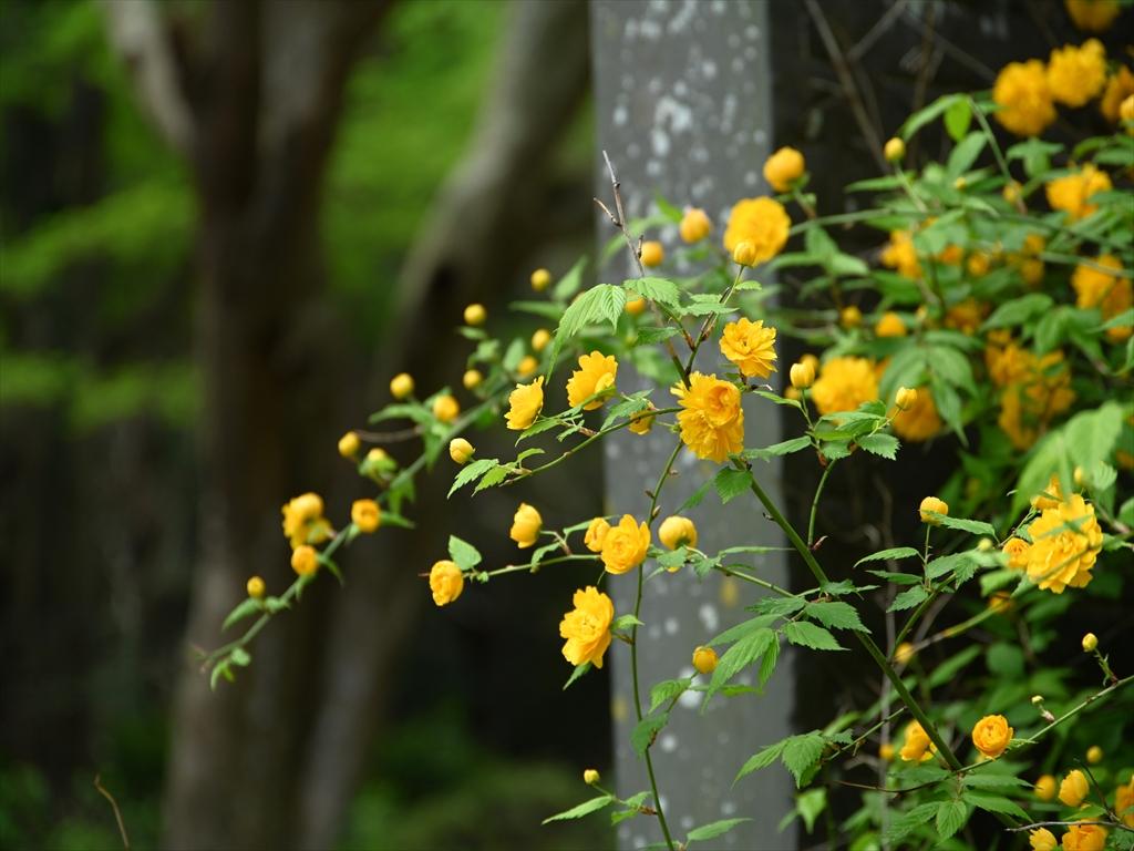 八重のヤマブキ、新緑のもみじもみられ、季節がゆっくり移り変わっていくようです。