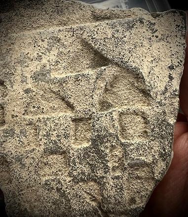BAM鎌倉の遺構から発掘された瓦の一部、北条氏の家紋(三つ鱗紋)が刻印されている。