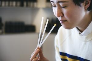 こちらでは調香スタッフのレクチャーで調香体験をして、自分で配合を決めたルームフレグランスを作ってもらうことができます。まずは先端を精油に浸したムエット(調香紙)を香って、32種類から好きな香りを選びましょう。先入観にとらわれないように、精油の名前はあえて伏せられているので、NO.1~32の順番で香り、直感で心地いいと感じる香りをピックアップ。何種類選んでもOKです。