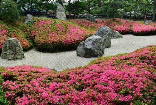浄土宗の教えの流れを表現している石庭。三尊とは、極楽浄土の阿弥陀仏とその脇士たる観音・勢至の二大菩薩を表し、五祖は浄土教を説法流布された釈尊(印度)、善導(中国)、法然、鎮西、記主の浄土宗五大祖師を示します。この三尊五祖が、庭園の中に石で表現されています。庭園全体の構図は、煩悩の多いこの世(此岸)と救われていく彼の岸(彼岸)を示しています。5月にはサツキが見頃を迎え、石庭を彩ります。