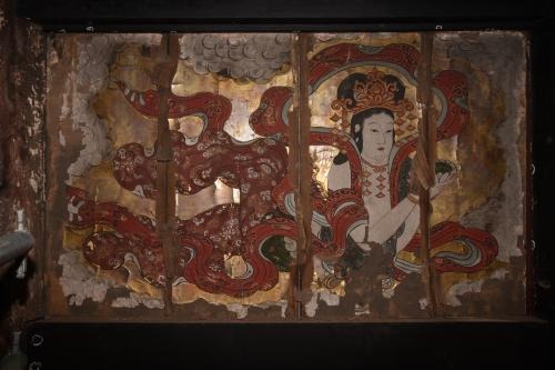 工事が進む中、2021年春には、大殿内の本尊が安置されている厨子から左右一対の天女の壁画が発見されました。壁画は金箔が施された色鮮やかな状態で見つかり、大変な話題となりました。現在、専門家による分析中ですが、今後、大殿の工事風景も含め、展示できる機会を検討しています。