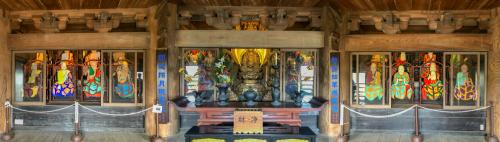 2階には、釈迦三尊、四天王、十六羅漢が祀られており、山門南側からは鎌倉の海が一望できる絶好のロケーションが楽しめます。東は鎌倉時代に東国の貿易の拠点として開発された日本最古の築港遺跡「和賀江島」、西は新田義貞が鎌倉攻めの際に海中に宝剣を投げたとされる「稲村ヶ崎」や「江の島」が望めます。
