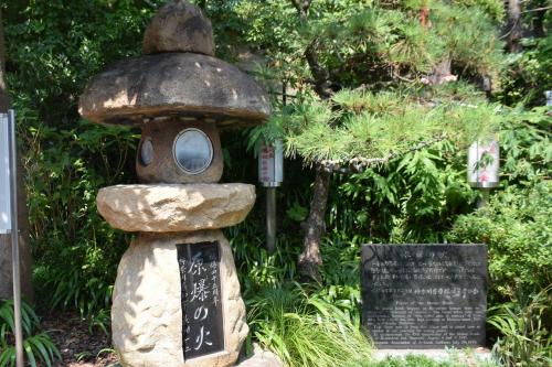 大船観音寺の境内に、広島原爆の残り火が、今でもこの灯籠の中で灯され続けています。広島原爆投下から45年にあたり、福岡県星野村の平和の塔から分火されたものです。「戦没者慰霊碑」には多くの折り鶴が掲げられています。