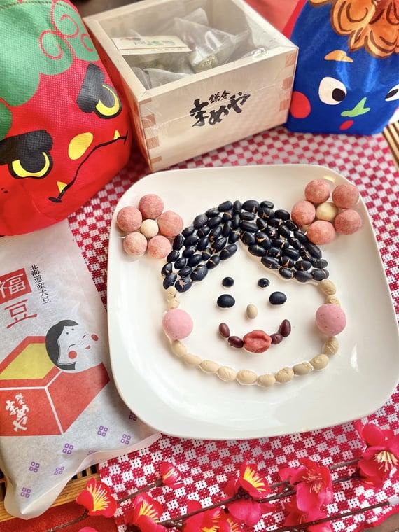 写真は、節分の日に合わせて鎌倉まめやの商品を使ってデコレーションした影山さんの力作”福の神”です。