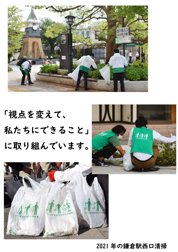 鎌倉市では、鎌倉市観光協会が実施している鎌倉駅西口の時計台広場の定期清掃に2020年12月の第1回より参加。駅前広場は、集合や休憩として多くの観光客が訪れる場所でもあります。ゴミを拾うだけではなく、ベンチや路面の汚れを落としたり、植木エリアの清掃など、意外にやることは多いものです。この活動には、自治体や市民団体、観光事業者、市民など幅広い方々が参加されています。