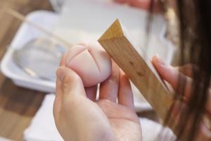 続いて、花びらを作る工程です。三角柱の木製のへら「三角べら」の辺を押し付けて、ラインを5本つけます。線と線の間に人差し指を滑らせてくぼみをつけると…。あら不思議、ぐっと桜らしく見えてきました。
