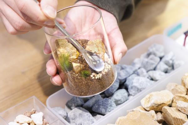 容器に石や砂を配置し、苔を植え付け、自分だけの小さな世界を作りましょう。所要時間は1時間ほどで、完成品はお持ち帰りできます。