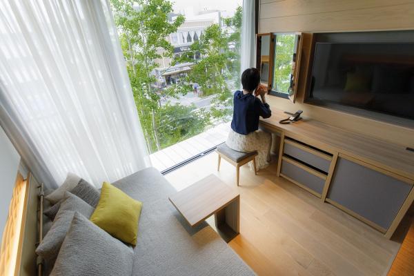 プレミアムコーナールーム(ダブル/ツイン)は45平方メートルという贅沢な広さ。天井から足元までガラス窓の角部屋で、鶴岡八幡宮の二ノ鳥居が眺められる人気の客室です。