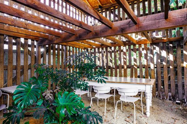 店舗の裏には酒屋さんの倉庫を改築したテラス席も。趣のある木造で、大きなグリーンを配した空間は植物園や秘密基地みたい。