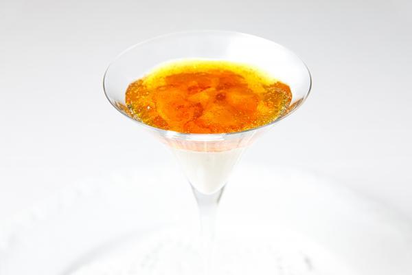 ディナー付き宿泊プランのコース内容はスペシャリテを含む前菜3種、肉料理、魚料理、デザートなどの全9品に、グラスドリンク1杯付き。写真はシェフのスペシャリテ「オマール海老のコンソメジュレ」。口当たりなめらかなムース状の根セロリのフォンダンの上にボイルしたオマール海老、さらに海老の殻で出汁をとったコンソメジュレがかかっています。